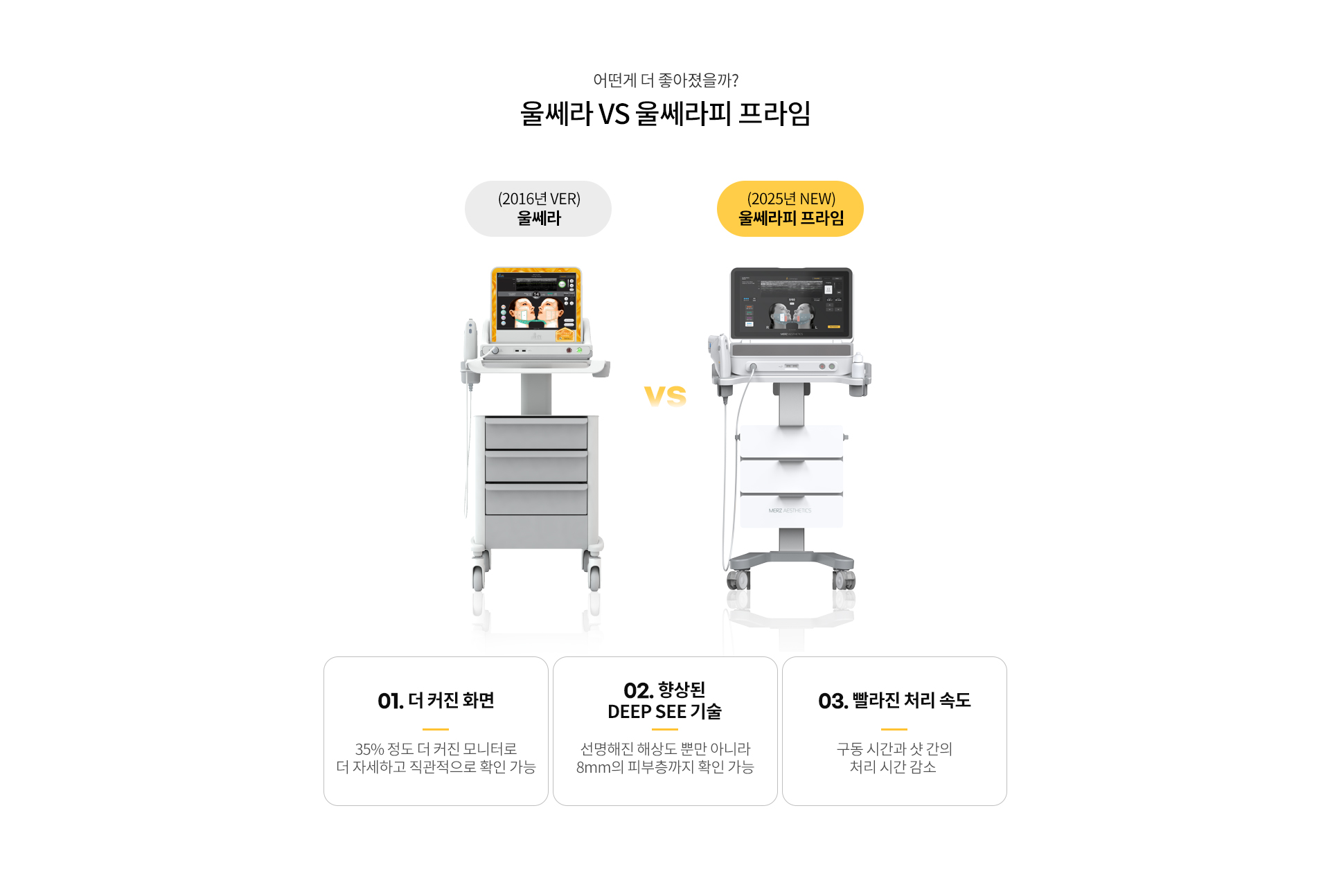 기존 울쎄라의 업그레이드 버전으로, 더 깊은 피부층까지 확인할 수 있는 대형 모니터를 통해 세밀한 초음파 디자인이 가능하며, 터치 반응 속도가 빨라져 시술 시간이 단축되었습니다. 또한 통증이 감소하고 콜라겐 재생 능력도 더욱 향상되었습니다.